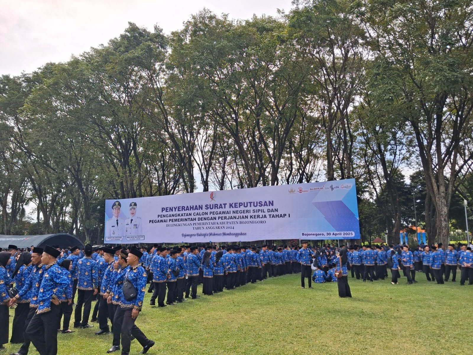 Jurnal Pelopor – Sebanyak 3.129 Aparatur Sipil Negara (ASN) resmi menerima Surat Keputusan (SK) pengangkatan dari Pemerintah Kabupaten Bojonegoro dalam sebuah seremoni yang digelar di Alun-alun Bojonegoro, Rabu sore (30/4/2025). Penyerahan dilakukan secara simbolis oleh Bupati Setyo Wahono dan Wakil Bupati Nurul Azizah, di hadapan ribuan ASN yang hadir.