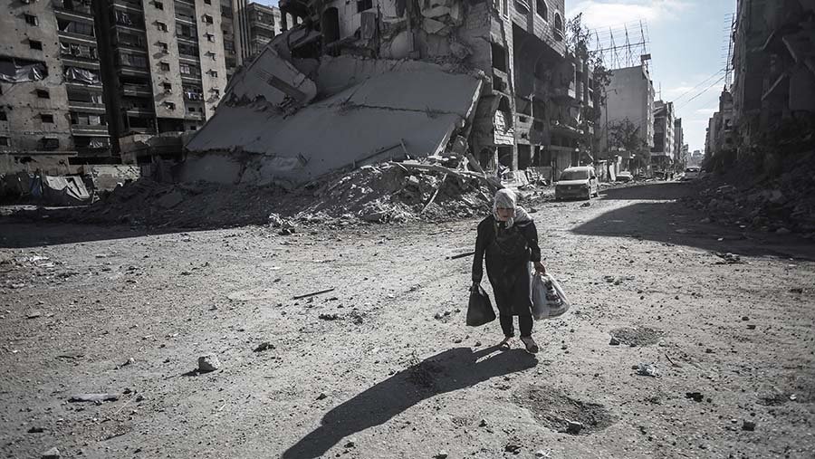 A Palestinian woman walks over blast debris in Gaza City, Gaza, on Monday, Sept. 29, 2025. Israeli troops pushed deep into Gaza City on Sunday, ahead of a meeting between US President Donald Trump and Israeli Prime Minister Benjamin Netanyahu focused on ending the war in the Palestinian territory. Photographer: Ahmad Salem/Bloomberg