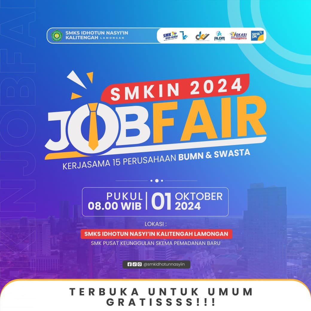 Kabar baik bagi pencari kerja, Gebyar Job Fair SMKIN 2024 akan diselenggarakan (01/10) di halaman SMK Idhotun Nasyi’in kecamatan Kalitengah Lamongan pukul 08.00 WIB. Rencananya acara tersebut akan dihadiri kurang lebih 15 perusahaan di Lamongan dan Gresik, baik sektor swasta maupun BUMN. Nova Hari Saputro, S.Pd. kepala sekolah SMK Idhotun Nasyi’in, mentargetkan lebih dari 500 pencari kerja akan memanfaatkan kesempatan ini untuk mencari pekerjaan.